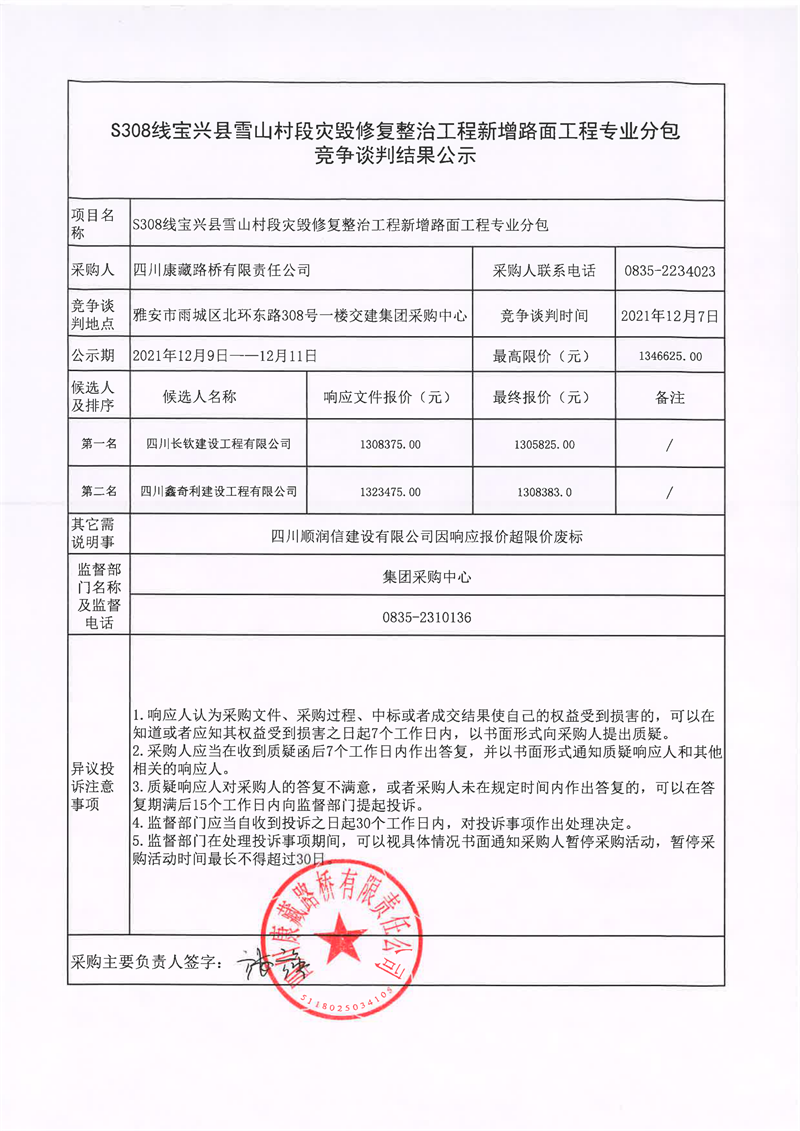 四川康藏路橋有限責(zé)任公司S308線(xiàn)寶興縣雪山村段災(zāi)毀修復(fù)整治工程新增路面工程專(zhuān)業(yè)分包競(jìng)爭(zhēng)談判結(jié)果公示