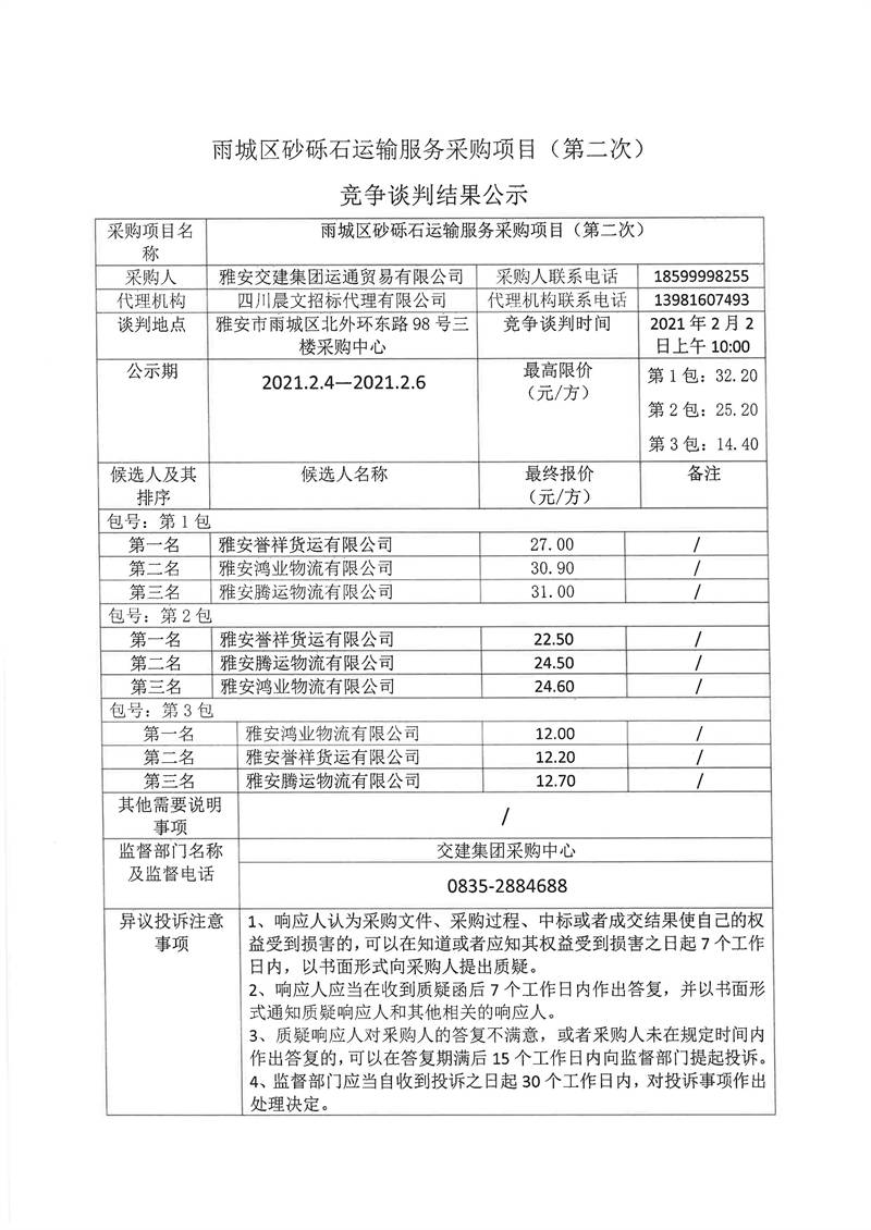 雅安交建集團(tuán)運(yùn)通貿(mào)易有限公司雨城區(qū)砂礫石運(yùn)輸服務(wù)采購項(xiàng)目(第二次)競爭談判結(jié)果公示
