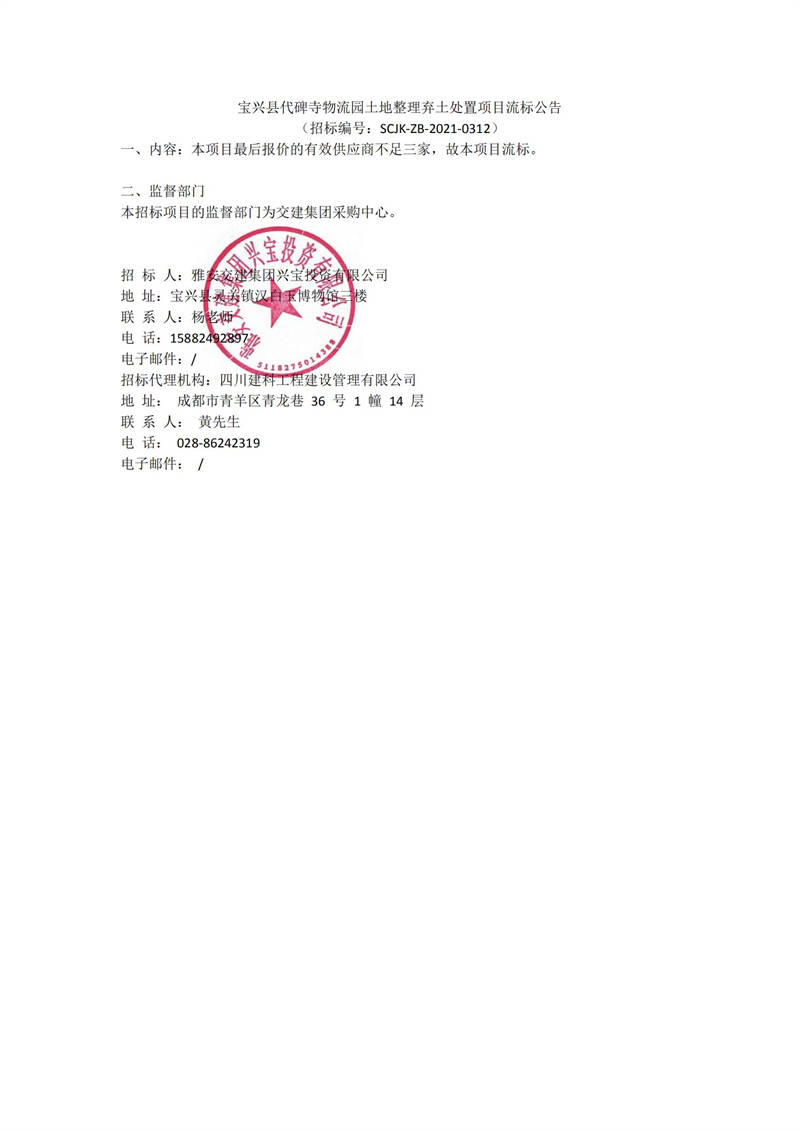 雅安交建集團興寶投資有限公司寶興縣代碑寺物流園土地整理棄土處置項目流標(biāo)公告