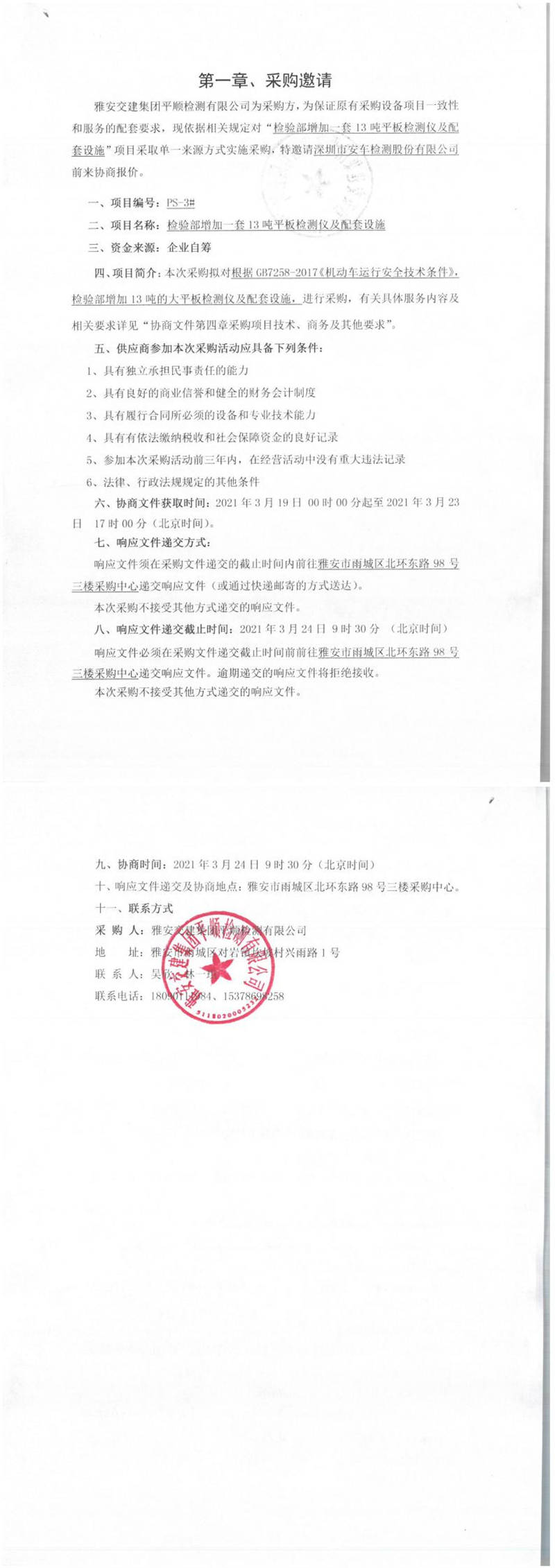 雅安交建集團(tuán)平順檢測(cè)有限公司檢驗(yàn)部增加一套13噸平板檢測(cè)儀及配套設(shè)施單一來(lái)源采購(gòu)邀請(qǐng)