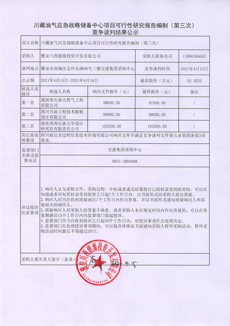 雅安川西能源投資開(kāi)發(fā)有限公司川藏油氣應(yīng)急戰(zhàn)略儲(chǔ)備中心項(xiàng)目可行性研究報(bào)告編制 (第三次)競(jìng)爭(zhēng)談判結(jié)果公示