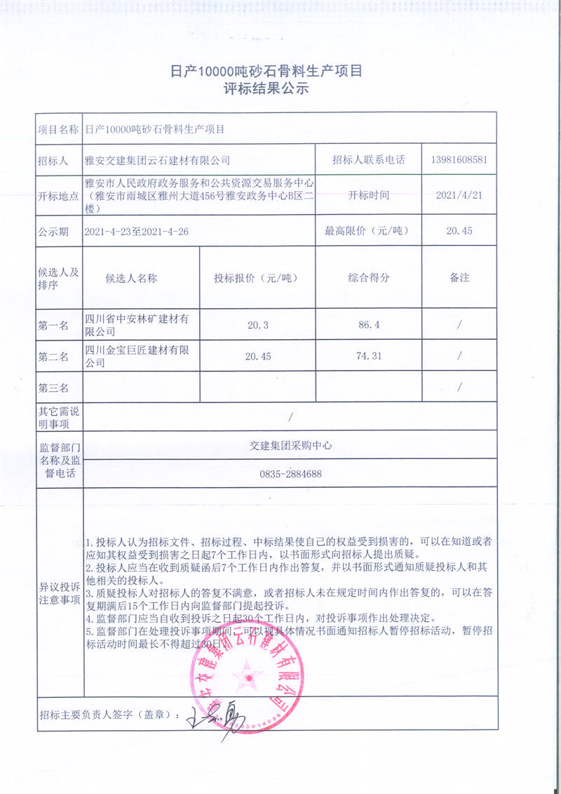 雅安交建集團(tuán)云石建材有限公司日產(chǎn)10000噸砂石骨料生產(chǎn)項(xiàng)目評標(biāo)結(jié)果公示