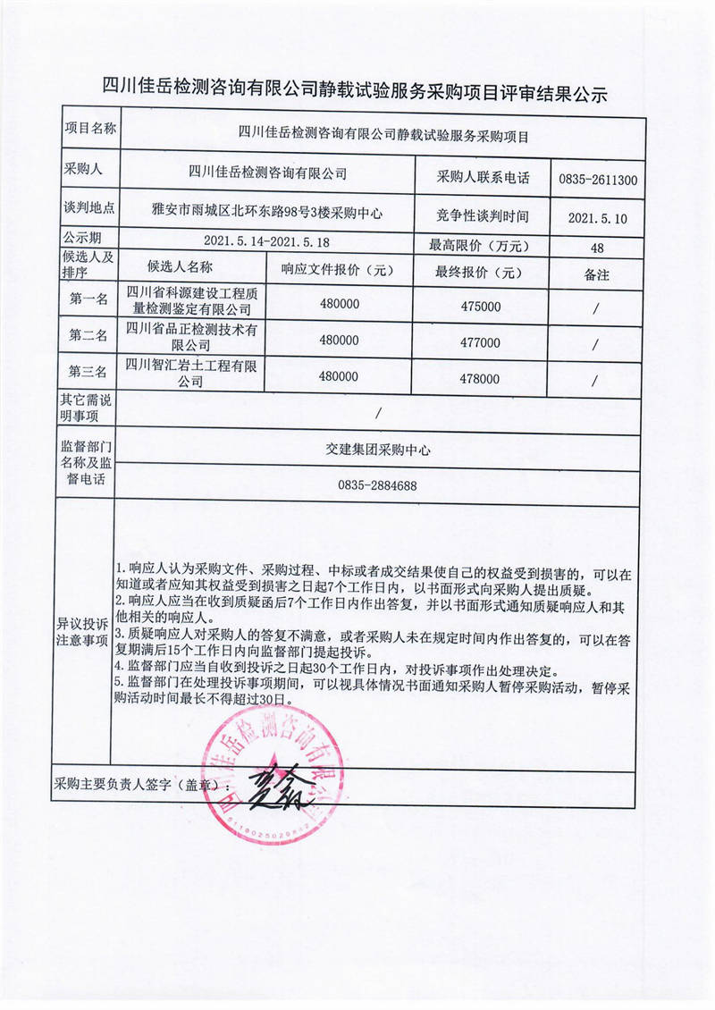 四川佳岳檢測咨詢有限公司靜載試驗(yàn)服務(wù)采購項(xiàng)目評審結(jié)果公示