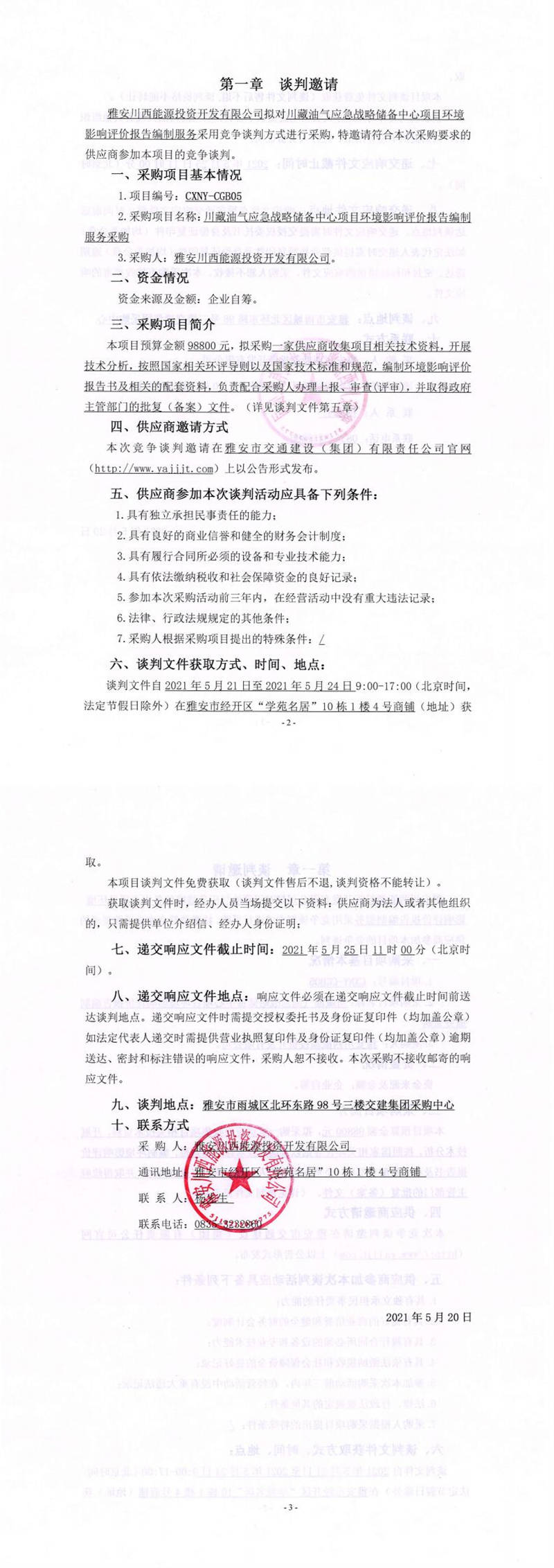 雅安川西能源投資開發(fā)有限公司川藏油氣應(yīng)急戰(zhàn)略儲備中心項目環(huán)境影響評價報告編制服務(wù)采購競爭談判公告
