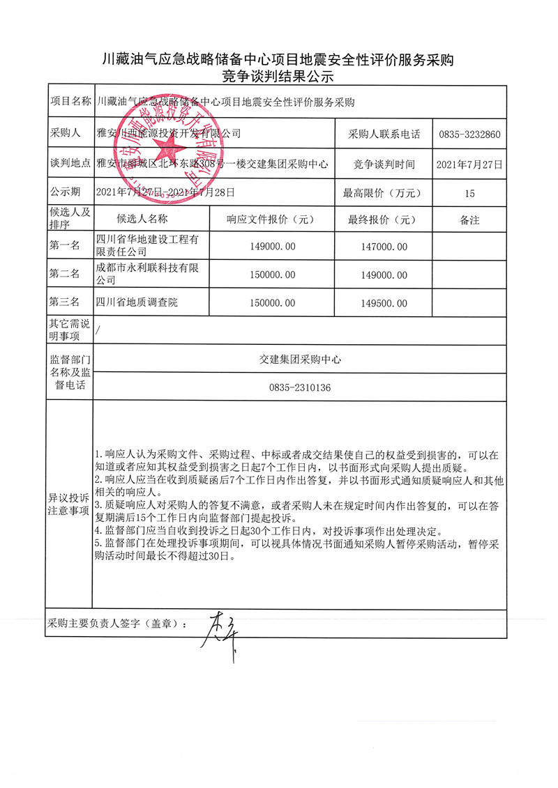 雅安川西能源投資開(kāi)發(fā)有限公司川藏油氣應(yīng)急戰(zhàn)略?xún)?chǔ)備中心項(xiàng)目地震安全性評(píng)價(jià)服務(wù)采購(gòu)競(jìng)爭(zhēng)談判結(jié)果公示