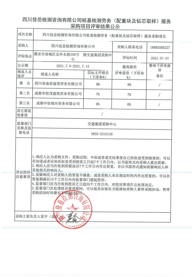 四川佳岳檢測咨詢有限公司樁基檢測勞務(wù)(配重塊及鉆芯取樣)服務(wù)采購項(xiàng)目評(píng)審結(jié)果公示