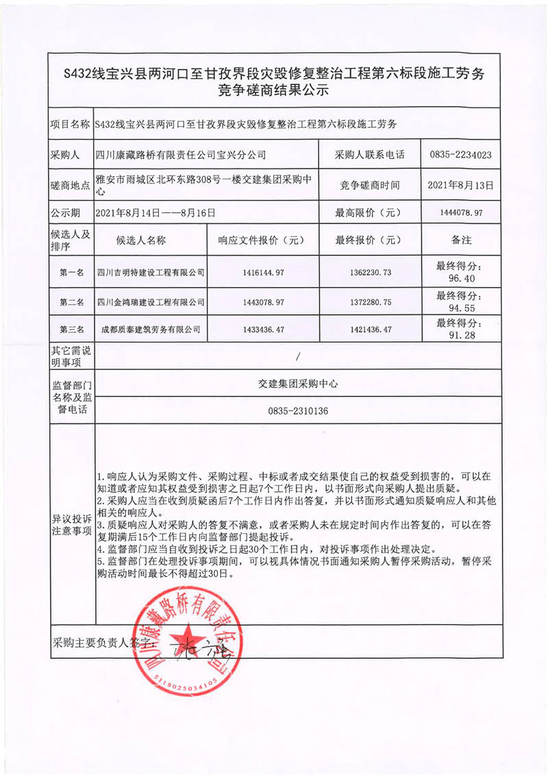 四川康藏路橋有限責任公司寶興分公司S432線寶興縣兩河口至甘孜界段災毀修復整治工程第六標段施工勞務競爭磋商結果公示