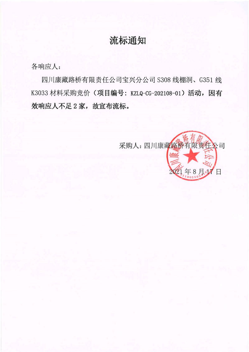 四川康藏路橋有限責(zé)任公司寶興分公司S308線棚洞、G351線K3033材料采購競(jìng)價(jià)流標(biāo)通知