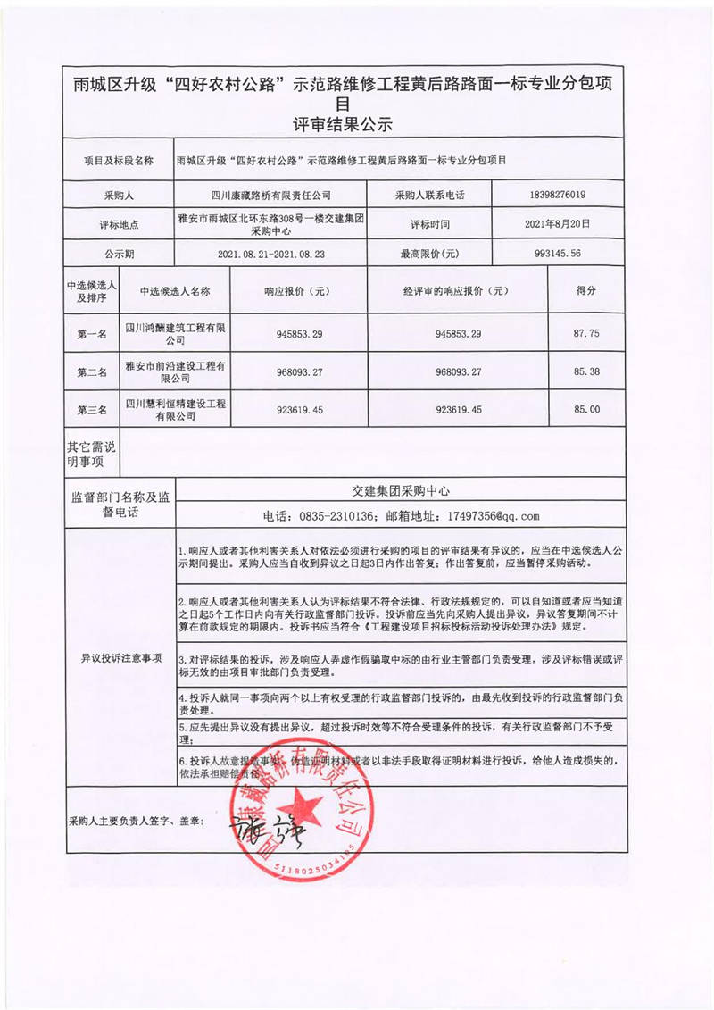 四川康藏路橋有限責任公司雨城區(qū)升級“四好農(nóng)村公路”示范路維修工程黃后路路面一標專業(yè)分包項目評審結(jié)果公示
