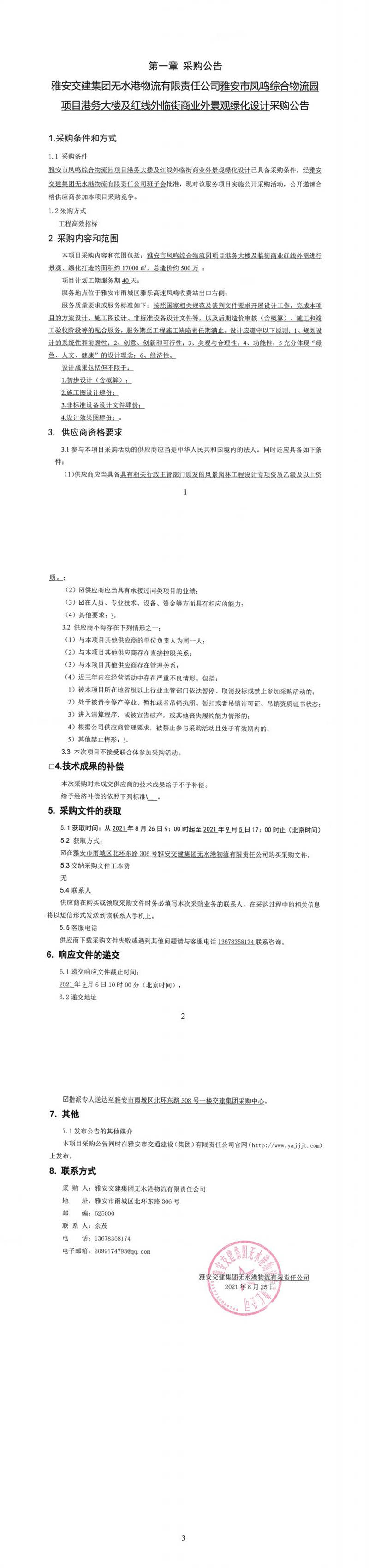 雅安交建集團無水港物流有限責任公司雅安市鳳鳴綜合物流園項目港務大樓及紅線外臨街商業(yè)外景觀綠化設計采購公告
