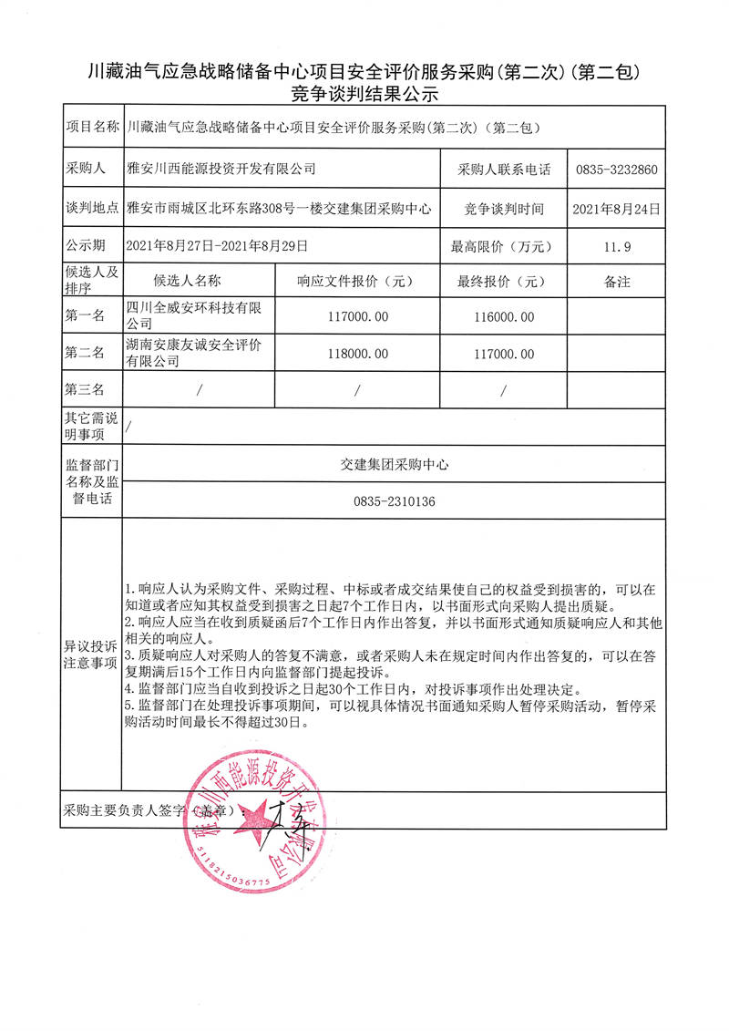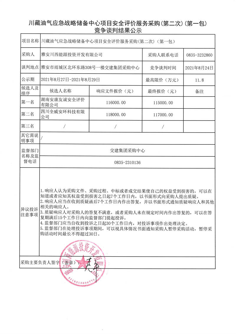 川藏油氣應(yīng)急戰(zhàn)略儲備中心項(xiàng)目安全評價(jià)服務(wù)采購(第二次)(第一包、第二包)競爭談判結(jié)果公示