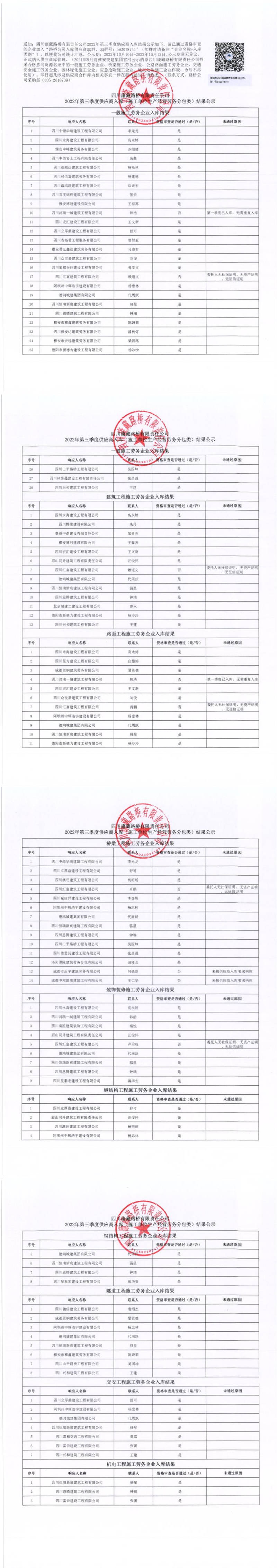 四川康藏路橋有限責任公司2022年第三季度供應(yīng)商入庫(施工單位生產(chǎn)經(jīng)營勞務(wù)分包類)結(jié)果公示