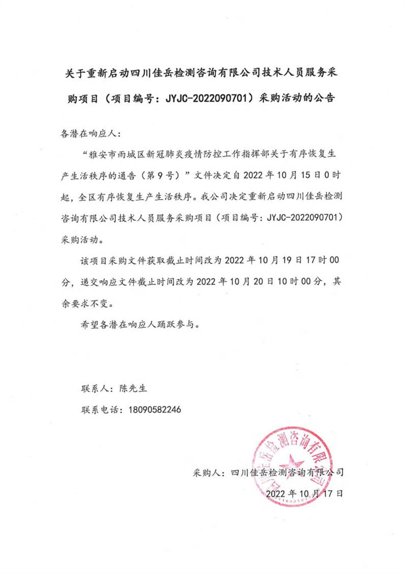四川佳岳檢測咨詢有限公司關(guān)于重新啟動四川佳岳檢測咨詢有限公司技術(shù)人員服務(wù)采購項(xiàng)目(項(xiàng)目編號:JYJC-2022090701)采購活動的公告