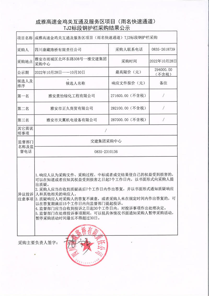 四川康藏路橋有限責任公司成都高速金雞關(guān)互通及服務(wù)區(qū)項目(雨名快速通道)TJ2標段鋼護欄采購結(jié)果公示