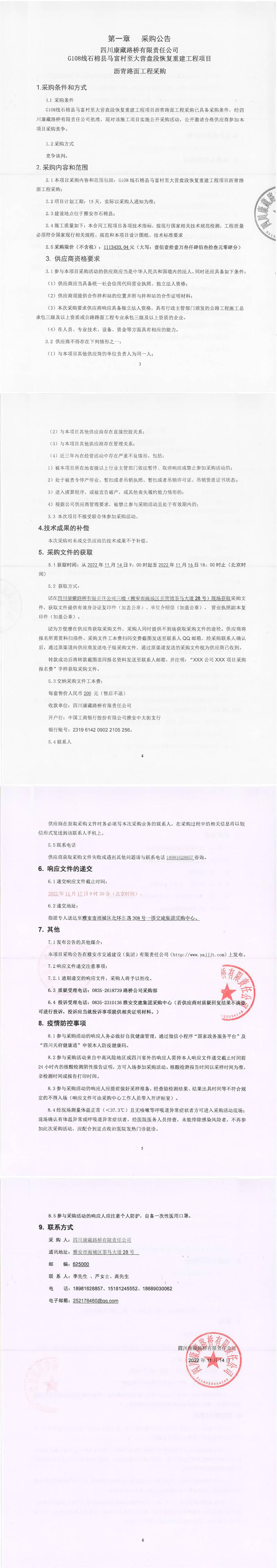 四川康藏路橋有限責(zé)任公司G108線石棉縣馬富村至大營(yíng)盤段恢復(fù)重建工程項(xiàng)目瀝青路面工程采購(gòu)公告