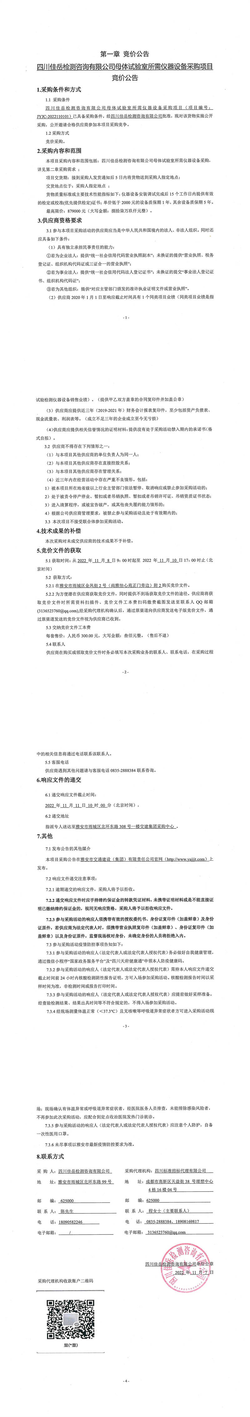 四川佳岳檢測(cè)咨詢有限公司母體試驗(yàn)室所需儀器設(shè)備采購(gòu)項(xiàng)目采購(gòu)公告