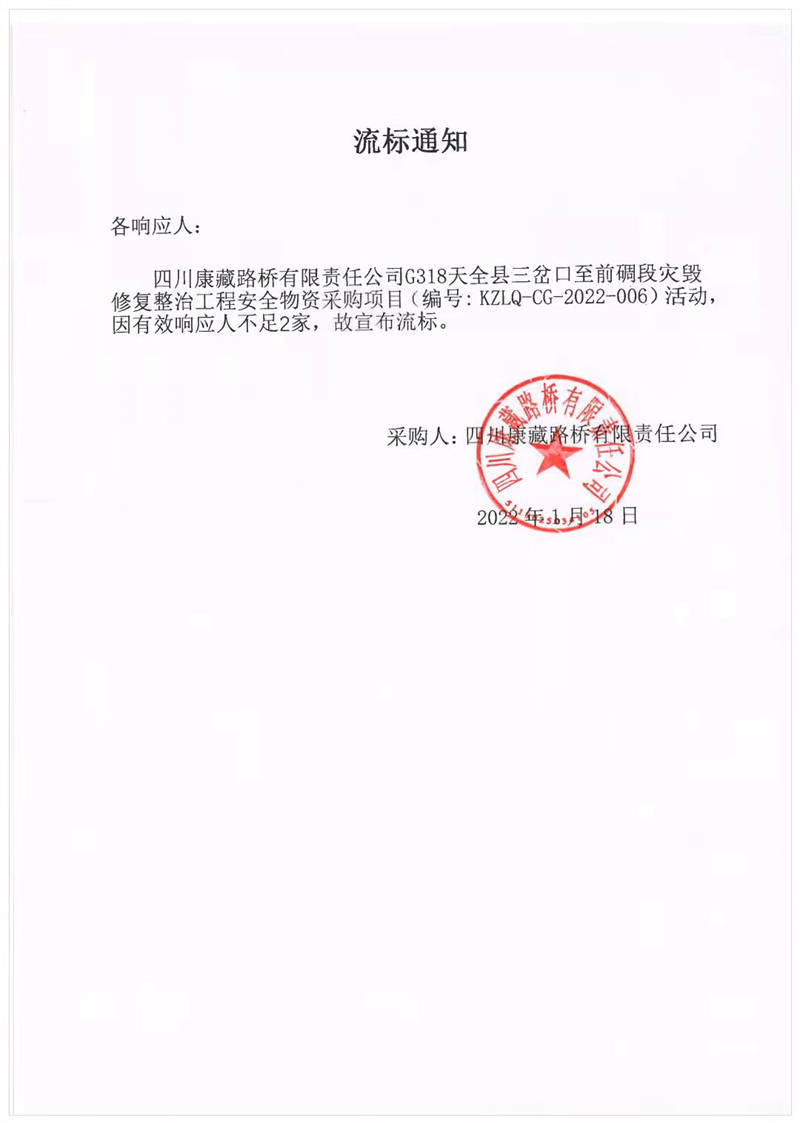 四川康藏路橋有限責(zé)任公司G318天全縣三岔口至前碉段災(zāi)毀修復(fù)整治工程安全物資采購項目流標(biāo)通知