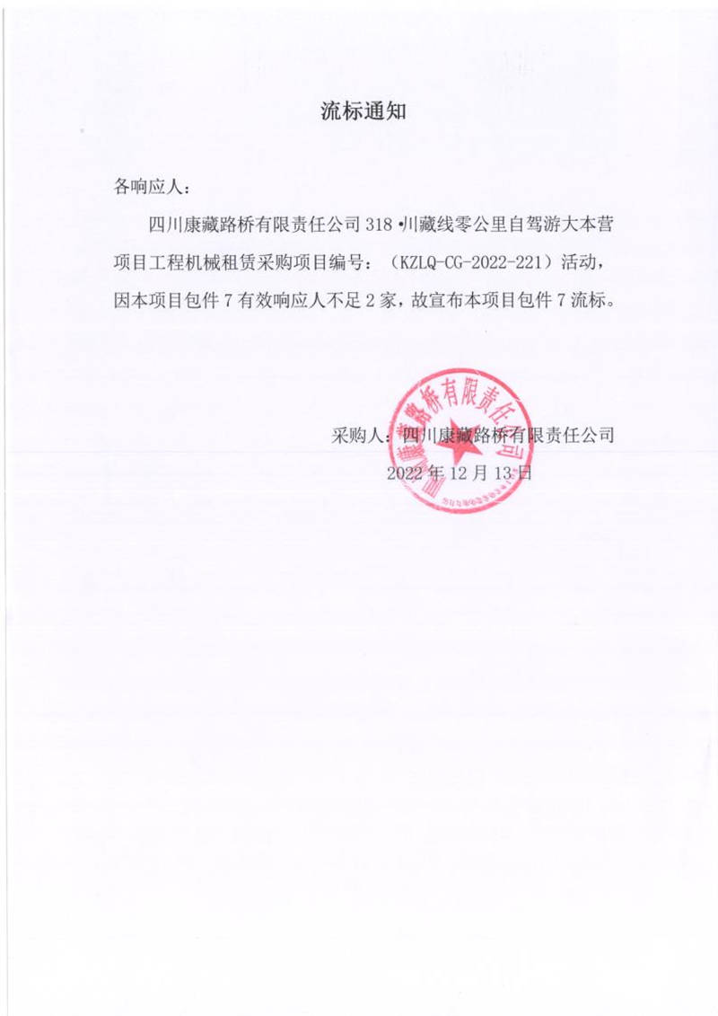四川康藏路橋有限責(zé)任公司318.川藏線零公里自駕游大本營(yíng)項(xiàng)目工程機(jī)械租賃采購(gòu)(包件7)流標(biāo)通知