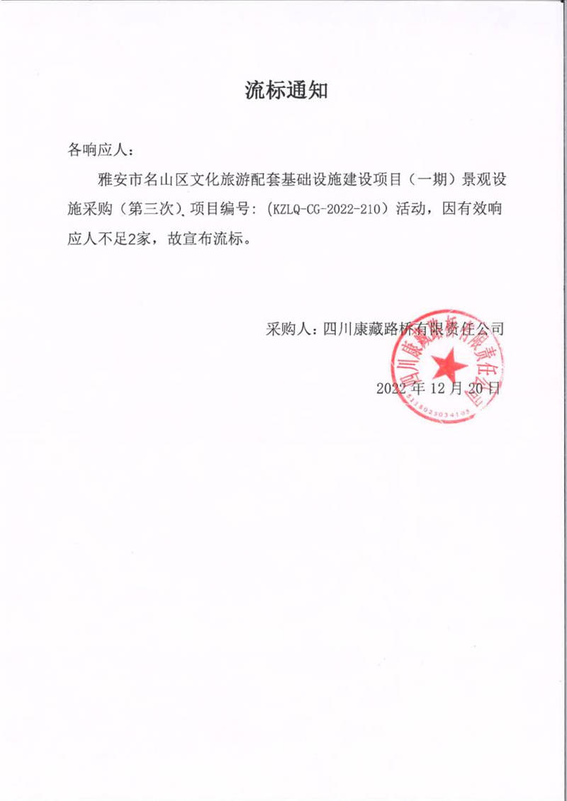 四川康藏路橋有限責任公司雅安市名山區(qū)文化旅游配套基礎(chǔ)設(shè)施建設(shè)項目(一期)景觀設(shè)施采購(第三次)流標通知
