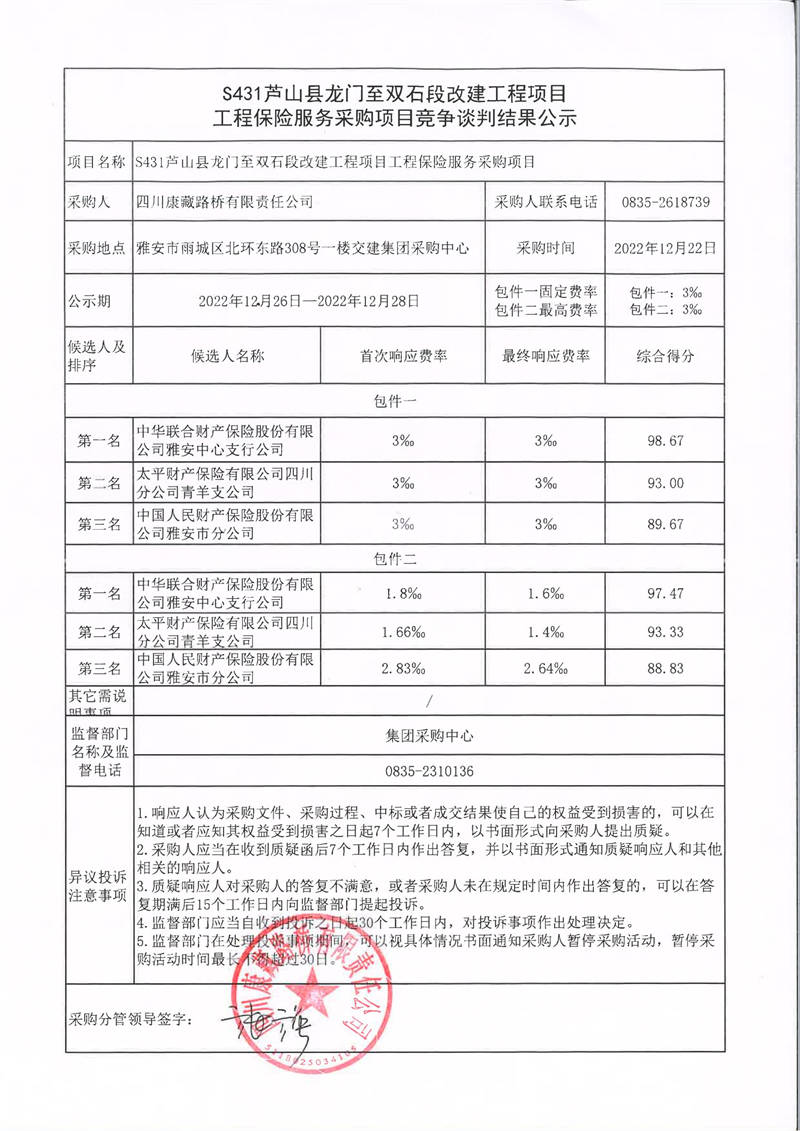 四川康藏路橋有限責(zé)任公司S431蘆山縣龍門至雙石段改建工程項(xiàng)目工程保險(xiǎn)服務(wù)采購(gòu)項(xiàng)目競(jìng)爭(zhēng)談判結(jié)果公示