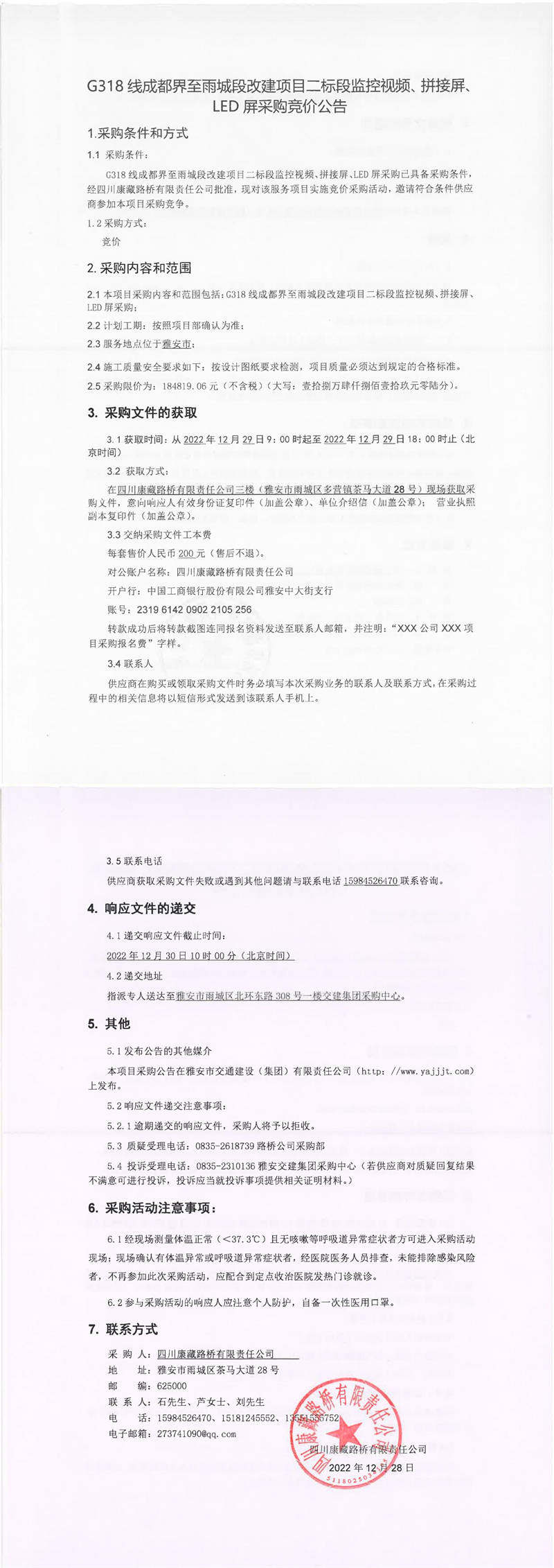 四川康藏路橋有限責(zé)任公司G318線成都界至雨城段改建項(xiàng)目二標(biāo)段監(jiān)控視頻、拼接屏、LED屏采購(gòu)競(jìng)價(jià)公告