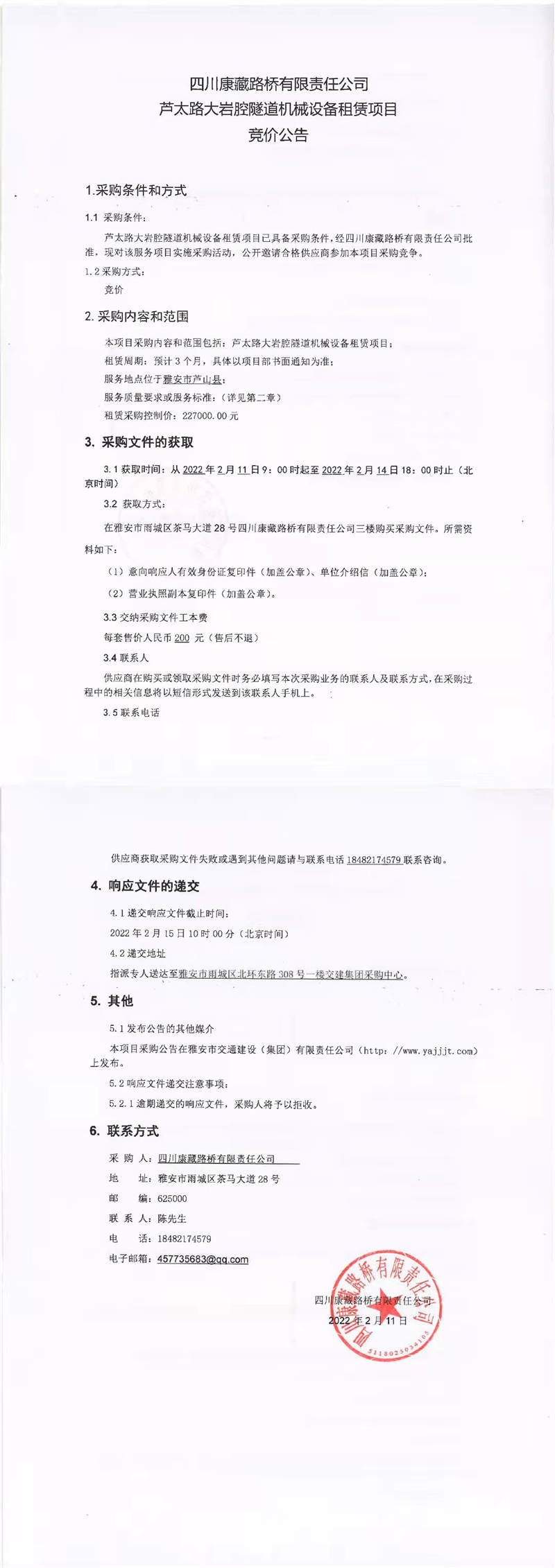 四川康藏路橋有限責(zé)任公司蘆太路大巖腔隧道機(jī)械設(shè)備租賃項目競價公告