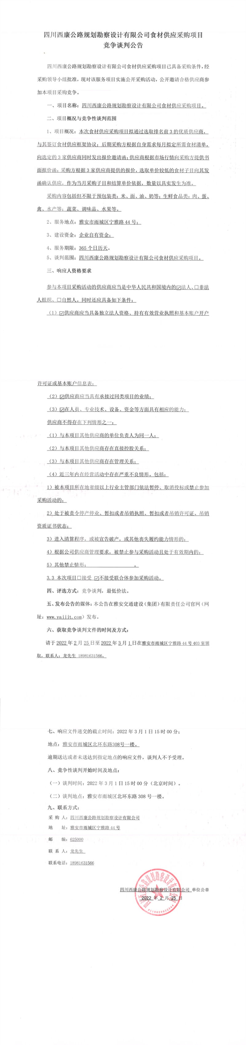 四川西康公路規(guī)劃勘察設(shè)計(jì)有限公司食材供應(yīng)采購項(xiàng)目競爭談判公告