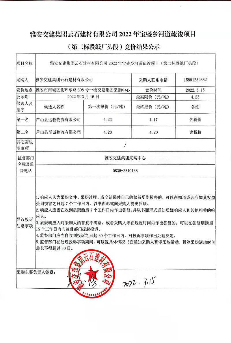雅安交建集團云石建材有限公司2022年寶盛鄉(xiāng)河道疏浚項目(第二標段紙廠頭段)競價結果公示