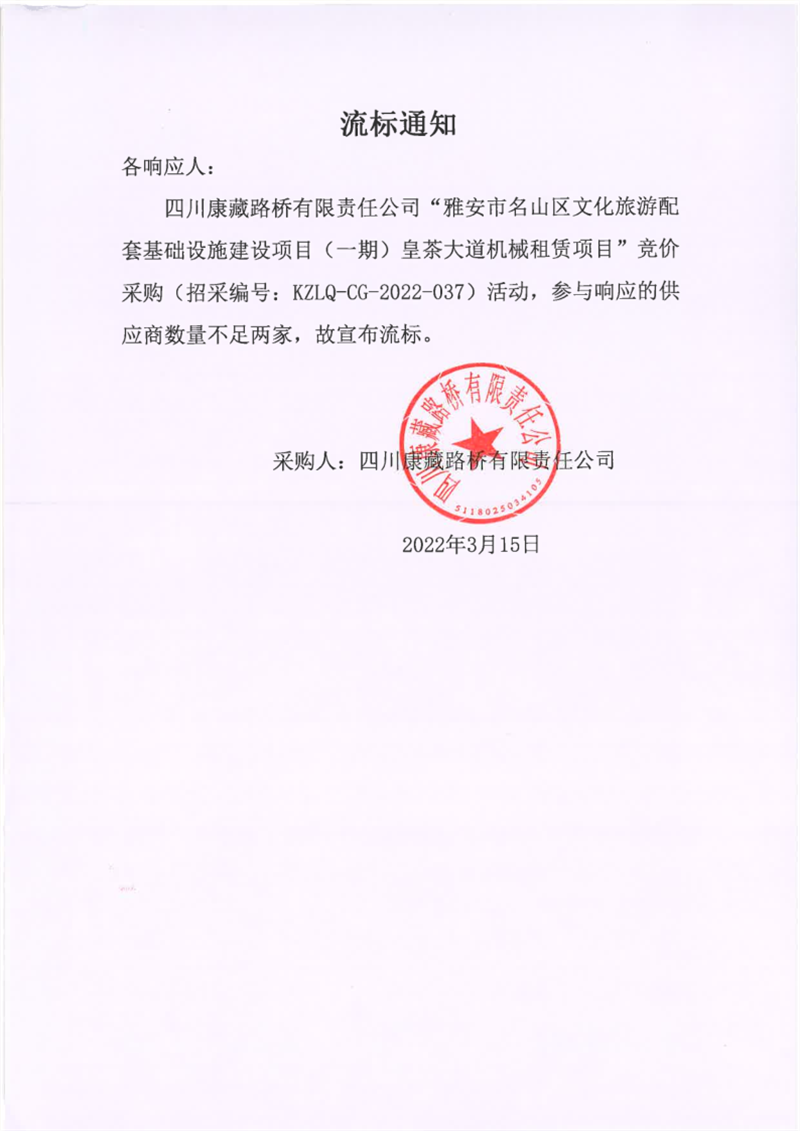 四川康藏路橋有限責(zé)任公司雅安市名山區(qū)文化旅游配套基礎(chǔ)設(shè)施建設(shè)項目(一期)皇茶大道機械租賃項目流標(biāo)通知
