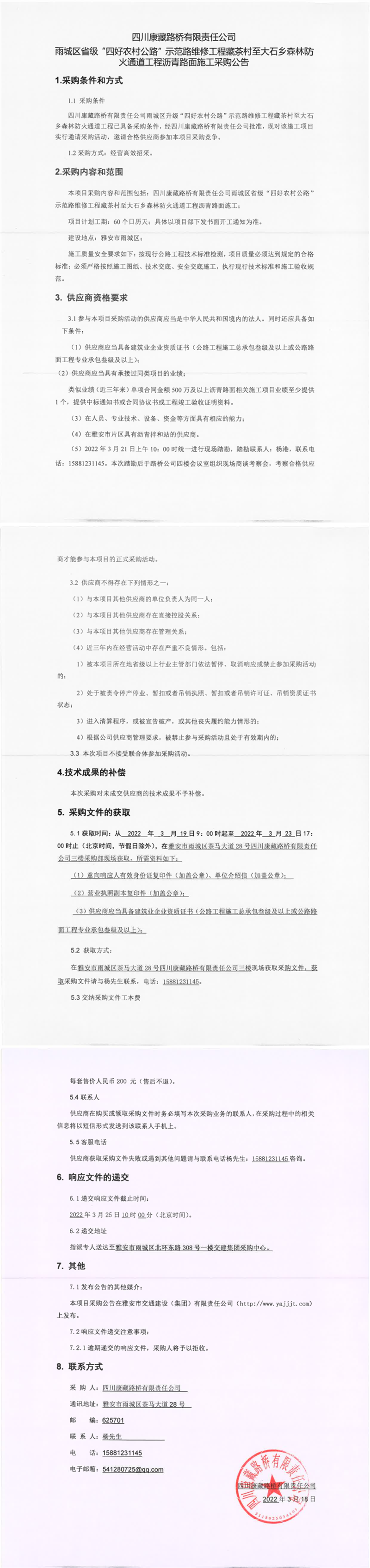 四川康藏路橋有限責(zé)任公司雨城區(qū)省級(jí)“四好農(nóng)村公路”示范路維修工程藏茶村至大石鄉(xiāng)森林防火通道工程瀝青路面施工采購公告