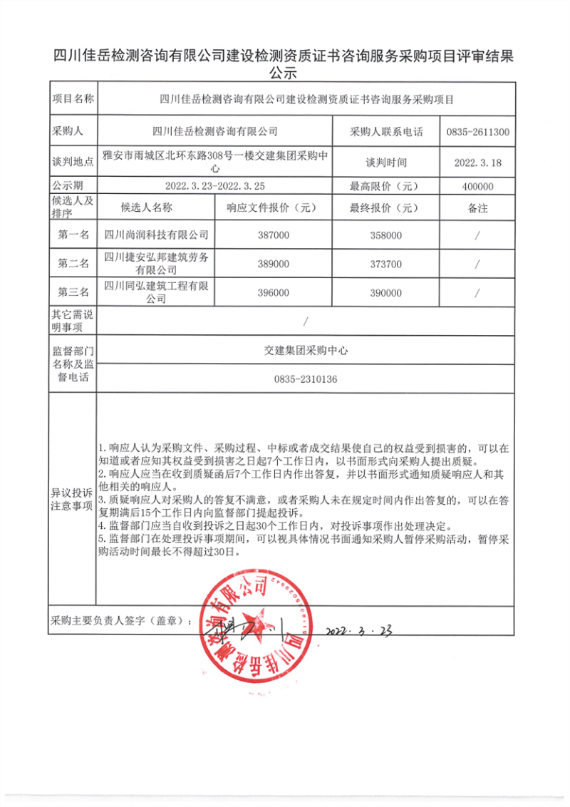 四川佳岳檢測咨詢有限公司建設檢測資質證書咨詢服務采購項目評審結果公示