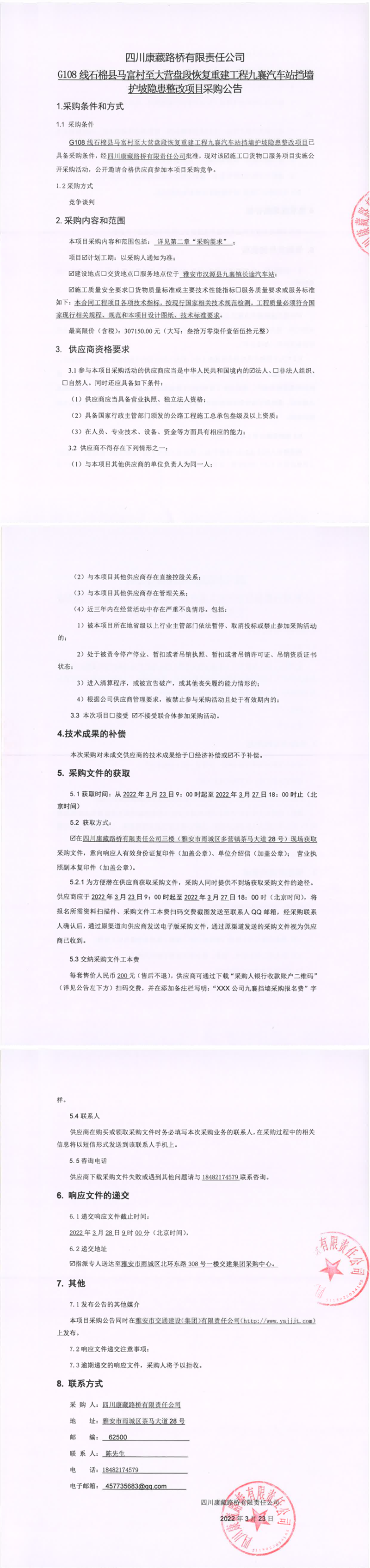 四川康藏路橋有限責(zé)任公司G108線石棉縣馬福村至大營(yíng)盤段恢復(fù)重建工程九襄汽車站擋墻護(hù)坡隱患整改項(xiàng)目采購(gòu)公告