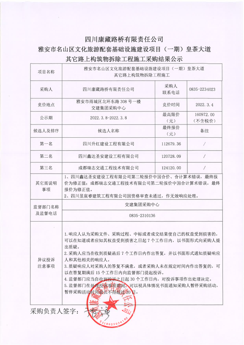 四川康藏路橋有限責任公司雅安市名山區(qū)文化旅游配套基礎設施建設項目(一期)皇茶大道其它路上構筑物拆除工程施工采購結果公示