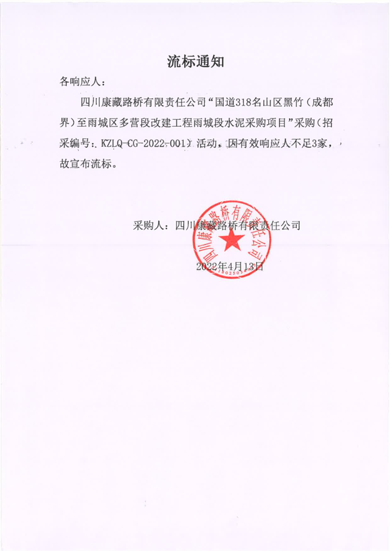 四川康藏路橋有限責(zé)任公司國道318名山區(qū)黑竹(成都界)至雨城區(qū)多營段改建工程雨城段水泥采購項(xiàng)目流標(biāo)通知