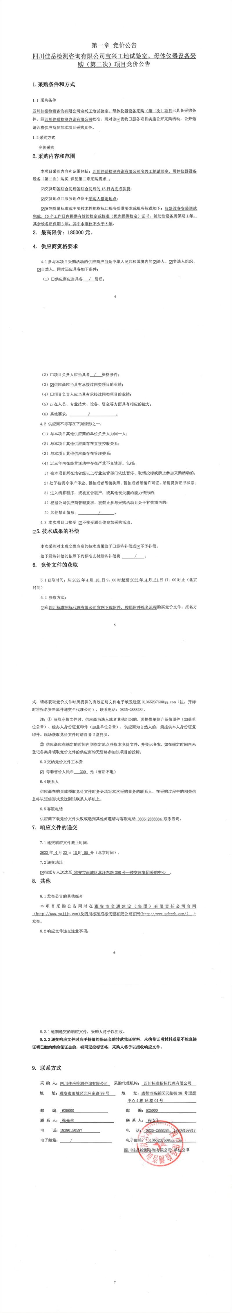四川佳岳檢測咨詢有限公司寶興工地試驗(yàn)室、母體儀器設(shè)備采購(第二次)項目競價公告