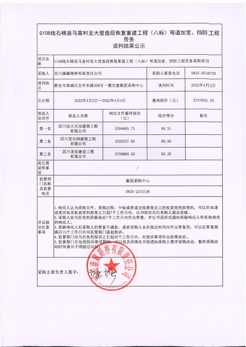 四川康藏路橋有限責(zé)任公司G108線石棉縣馬富村至大營(yíng)盤(pán)段恢復(fù)重建工程(八標(biāo))彎道加寬、擋防工程勞務(wù)談判結(jié)果公示