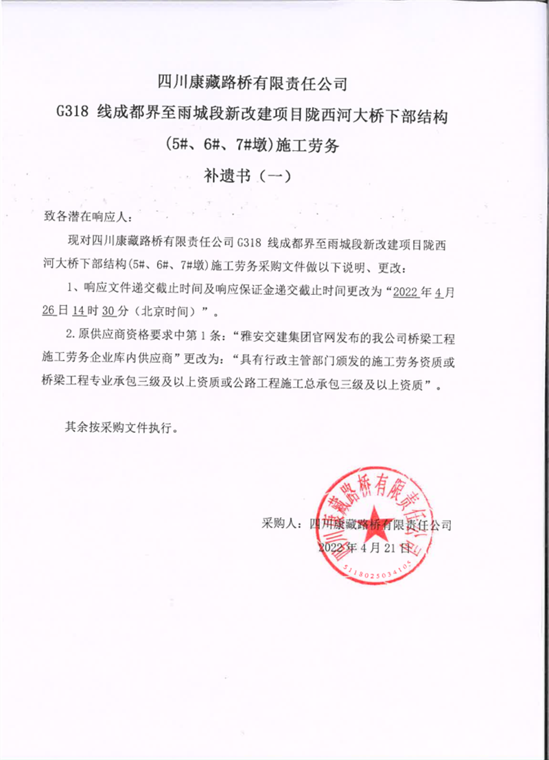四川康藏路橋有限責(zé)任公司G318線成都界至雨城段新改建項目隴西河大橋下部結(jié)構(gòu)(5#、6#、7#墩)施工勞務(wù)補遺書(一)
