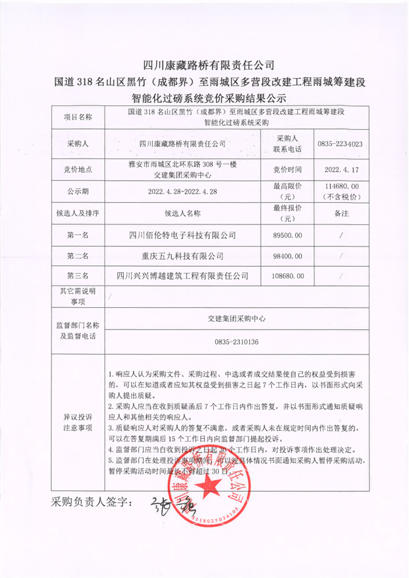 四川康藏路橋有限責(zé)任公司國(guó)道318名山區(qū)黑竹(成都界)至雨城區(qū)多營(yíng)段改建工程雨城籌建段智能化過磅系統(tǒng)競(jìng)價(jià)采購(gòu)結(jié)果公示