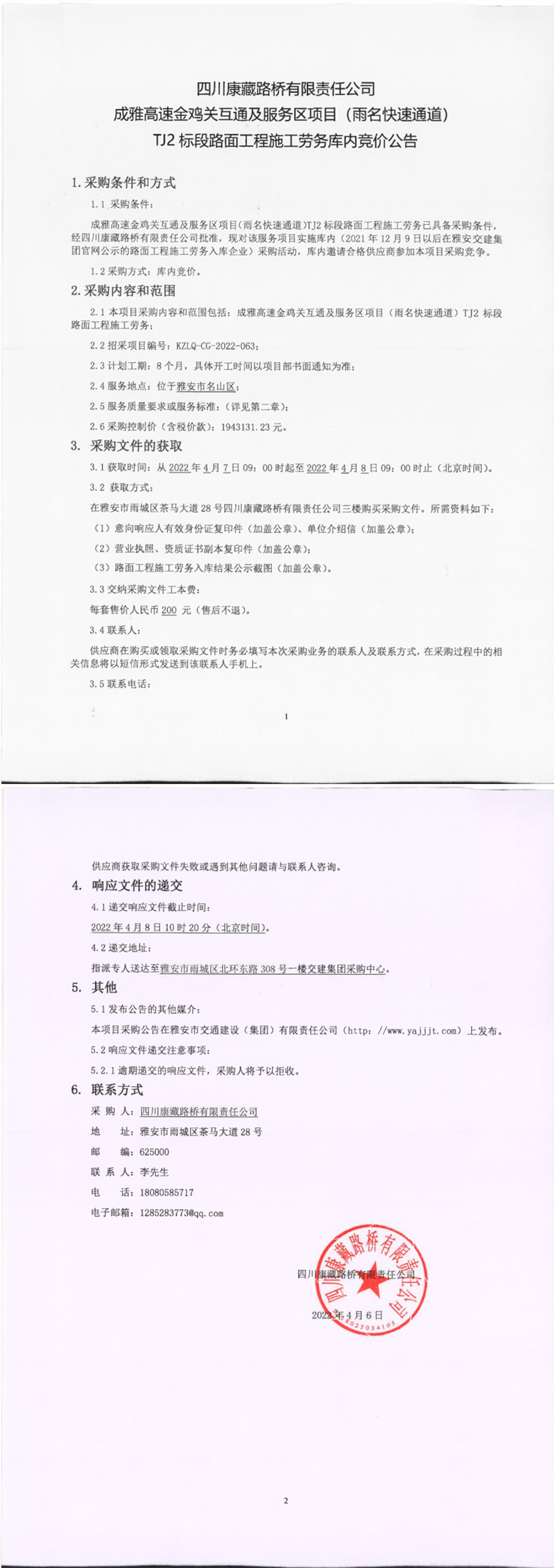 四川康藏路橋有限責任公司成雅高速金雞關互通及服務區(qū)項目(雨名快速通道)TJ2標段路面工程施工勞務庫內(nèi)競價公告