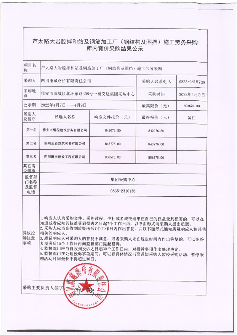 四川康藏路橋有限責任公司蘆太路大巖腔拌和站及鋼筋加工廠(鋼結構及圍檔)施工勞務采購庫內競價采購結果公示