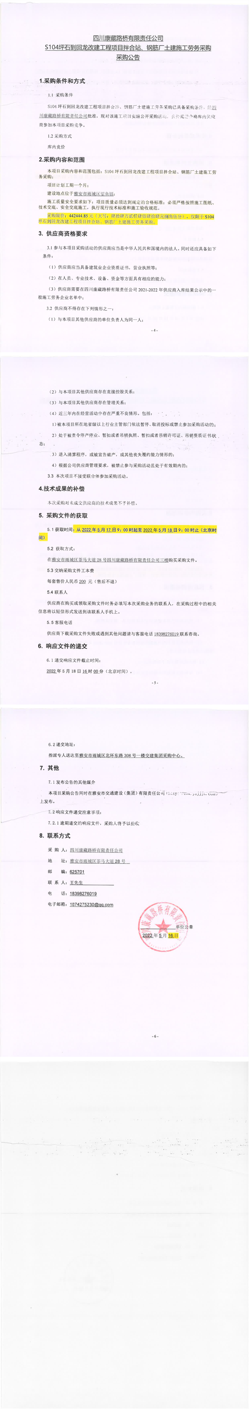 四川康藏路橋有限責(zé)任公司S104坪石到回龍改建工程項(xiàng)目拌合站、鋼筋廠土建施工勞務(wù)采購(gòu)采購(gòu)公告