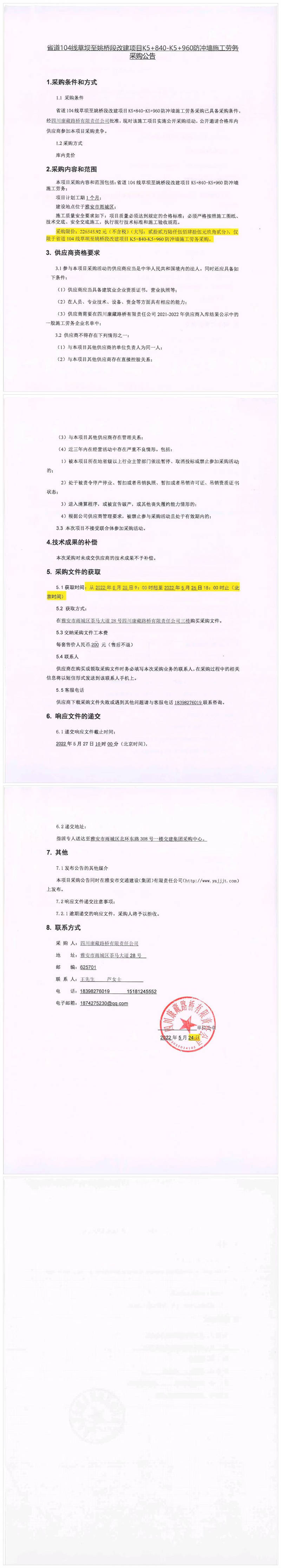 四川康藏路橋有限責(zé)任公司省道104線草壩至姚橋段改建項(xiàng)目K5+840-K5+960防沖墻施工勞務(wù)采購(gòu)公告