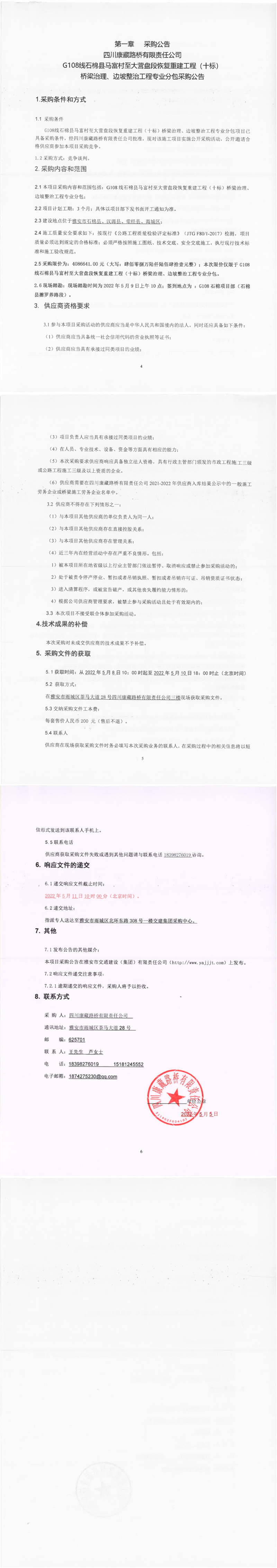四川康藏路橋有限責任公司G108線石棉縣馬富村至大營盤段恢復重建工程(十標)橋梁治理、邊坡整治工程專業(yè)分包采購公告