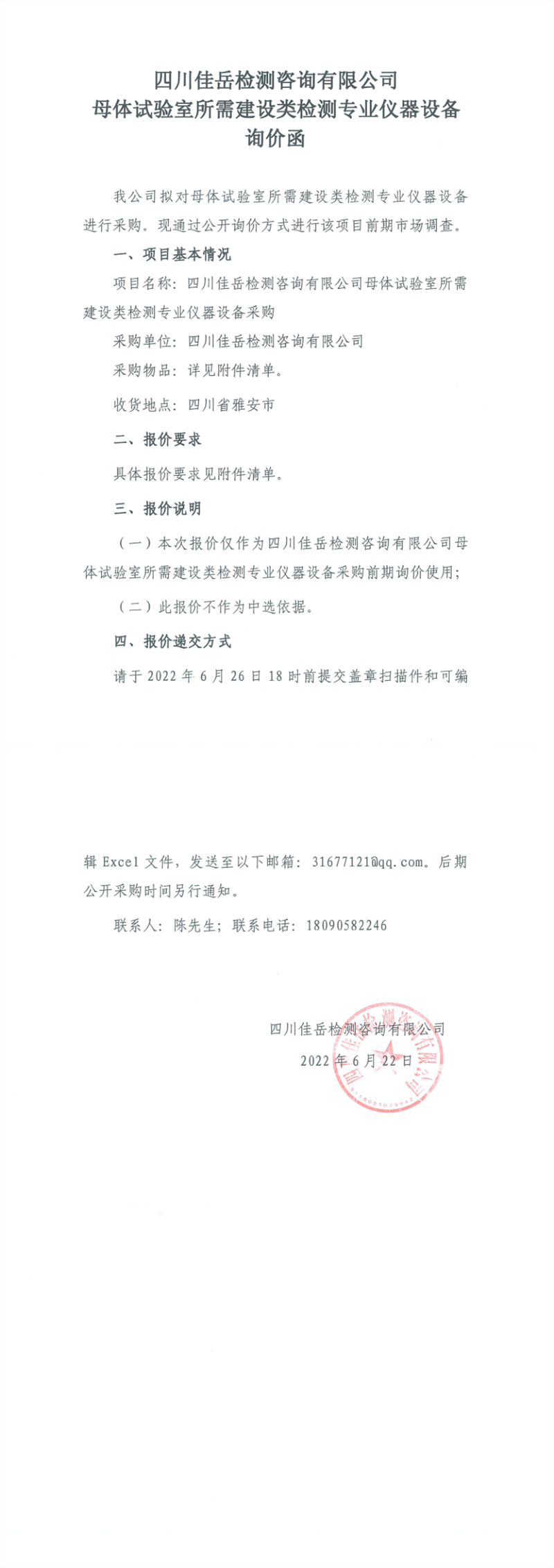 四川佳岳檢測咨詢有限公司母體試驗室所需建設類檢測專業(yè)儀器設備詢價函
