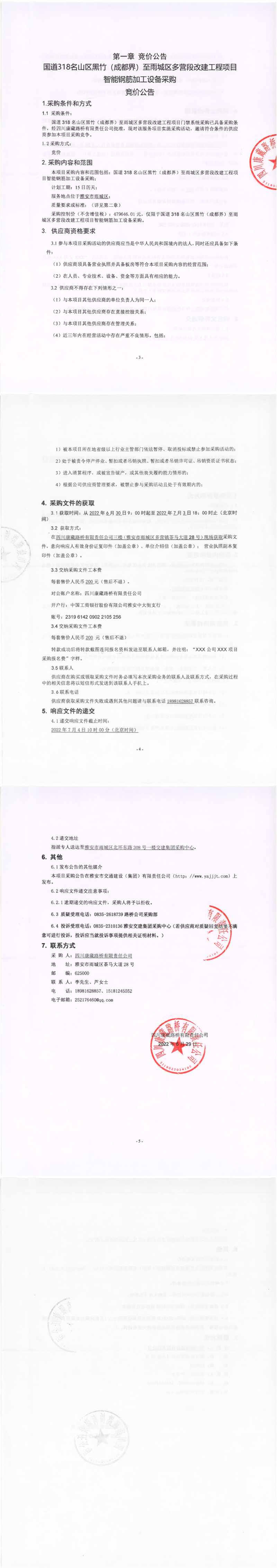 四川康藏路橋有限責任公司國道318名山區(qū)黑竹(成都界)至雨城區(qū)多營段改建工程項目智能鋼筋加工設(shè)備采購競價公告