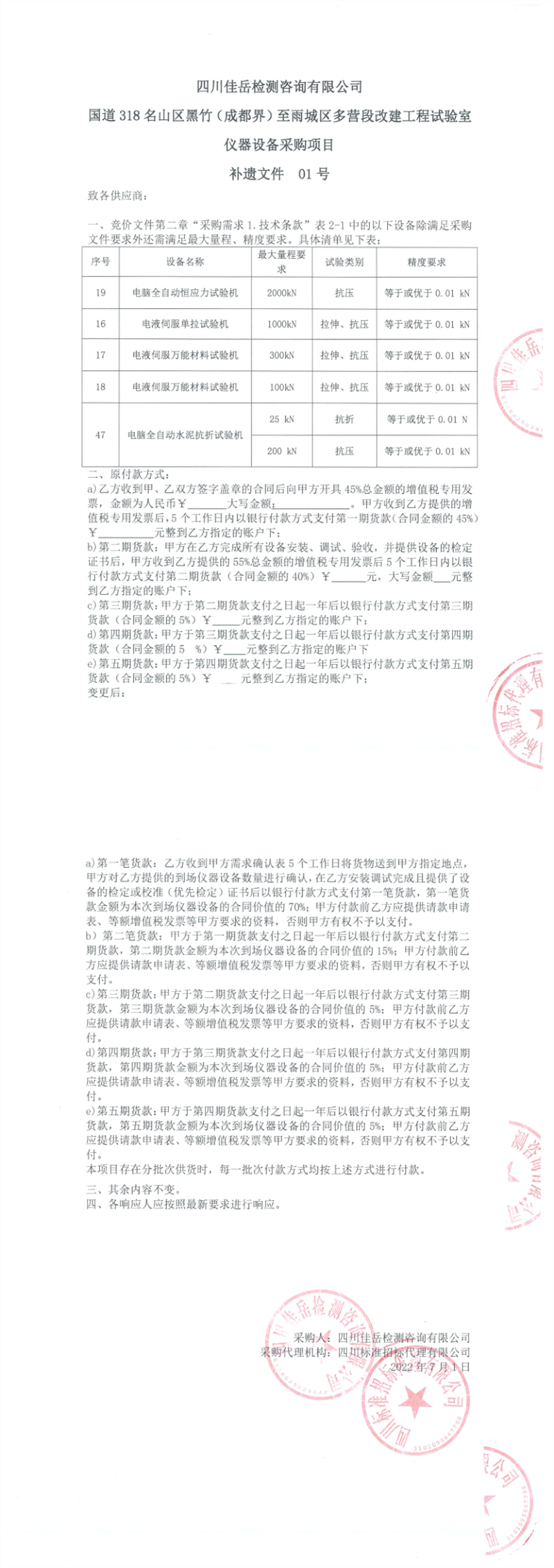 四川佳岳檢測(cè)咨詢有限公司國(guó)道318名山區(qū)黑竹(成都界)至雨城區(qū)多營(yíng)段改建工程試驗(yàn)室儀器設(shè)備采購(gòu)項(xiàng)目補(bǔ)遺文件01號(hào)
