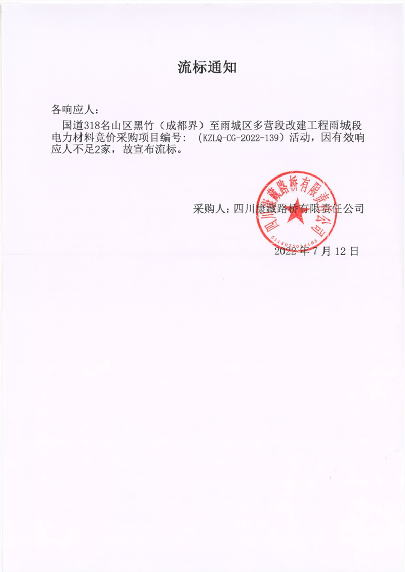 四川康藏路橋有限責(zé)任公司國道318名山區(qū)黑竹(成都界)至雨城區(qū)多營段改建工程雨城段電力材料競價采購項目流標通知