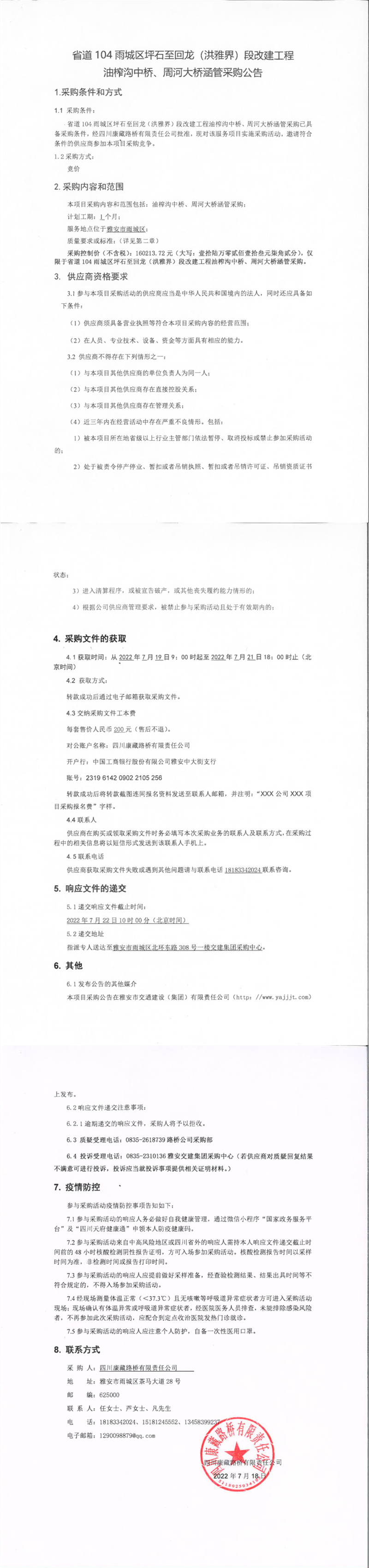 四川康藏路橋有限責(zé)任公司省道104雨城區(qū)坪石至回龍(洪雅界)段改建工程油榨溝中橋、周河大橋涵管采購(gòu)公告