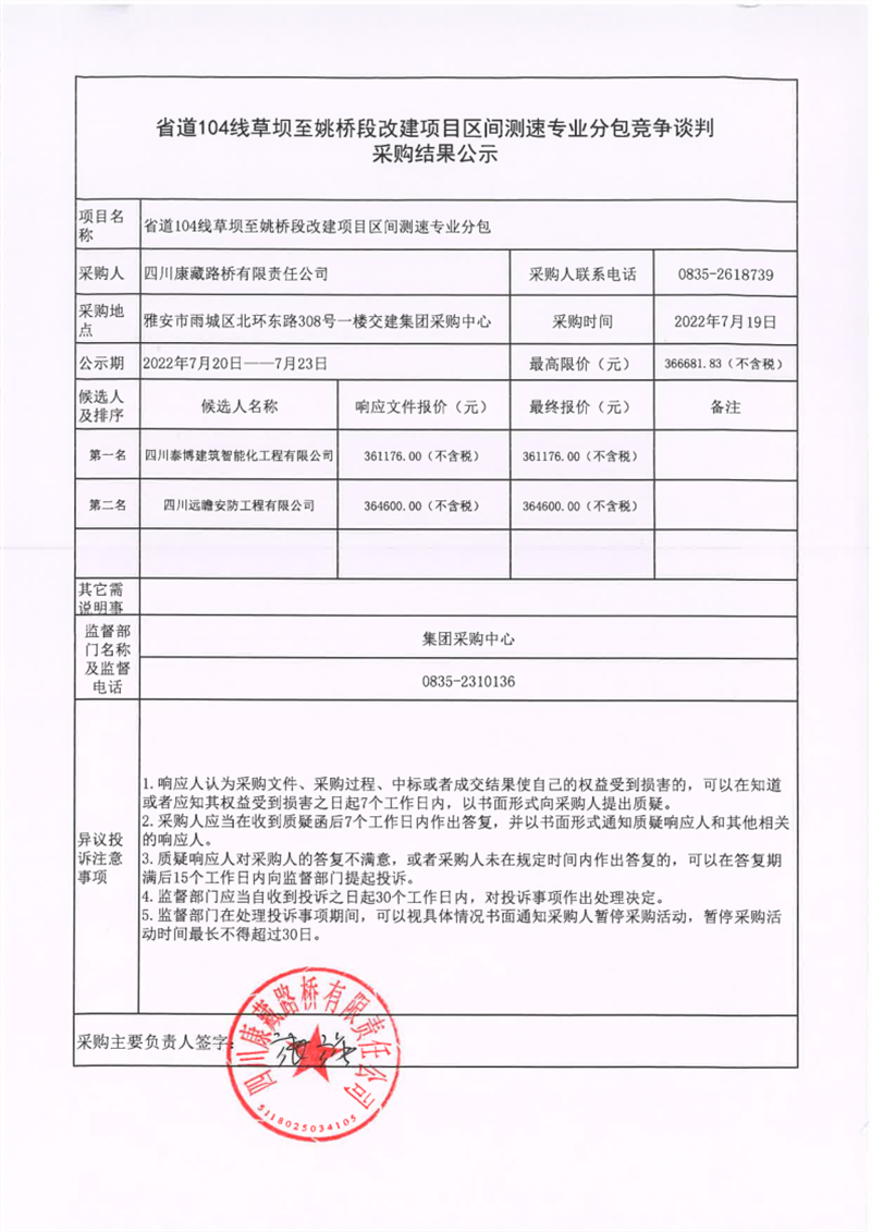 四川康藏路橋有限責(zé)任公司省道104線草壩至姚橋段改建項(xiàng)目區(qū)間測(cè)速專業(yè)分包競(jìng)爭(zhēng)談判采購(gòu)結(jié)果公示