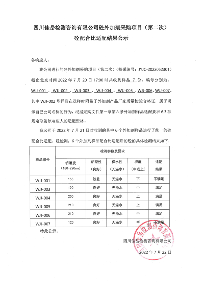 四川佳岳檢測咨詢有限公司砼外加劑采購項目(第二次)砼配合比適配結(jié)果公示